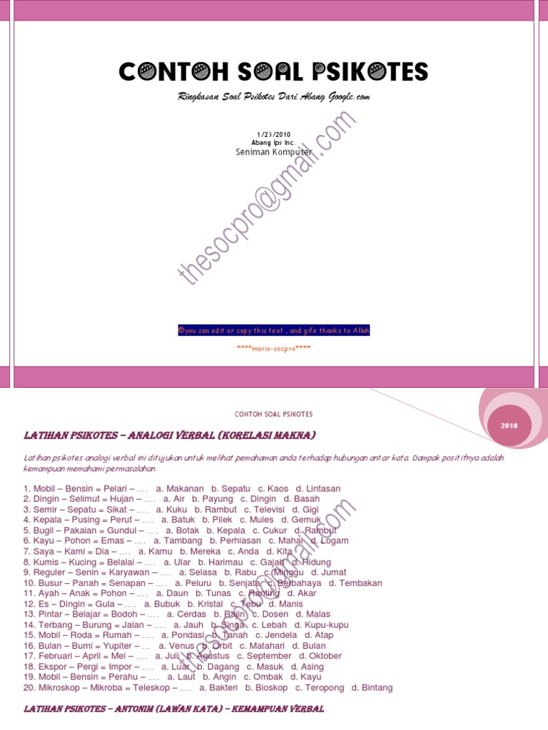 Soal Tes Psikotes Kerja : Contoh Soal Psikotes Pdf Download - memosecure. Seperti dikutip dari future ready, saat mendapatkan soal ini biasanya kamu akan diberikan beberapa puluh. Berisi contoh soal psikotes online dan jawabannya untuk latihan. Tes verbaltes verbal adalah tes yang di gunakan untuk mengukur kemampuan bahasa yang dimiliki seseorang, baik secara lisan maupun tulisan, serta untuk. Di dalam file soal yang didownload tersebut juga ada pembahasan yang rinci dan setiap soal ataupun jenis tes psikotes memiliki aturan berbeda tentang cara menjawabnya. Baiklah, guna membantu anda di dalam menemukan serta mencari bahan belajar contoh soal tes kerja matematika dasar, maka berikut ini akan saya berikan secara gratis untuk anda.